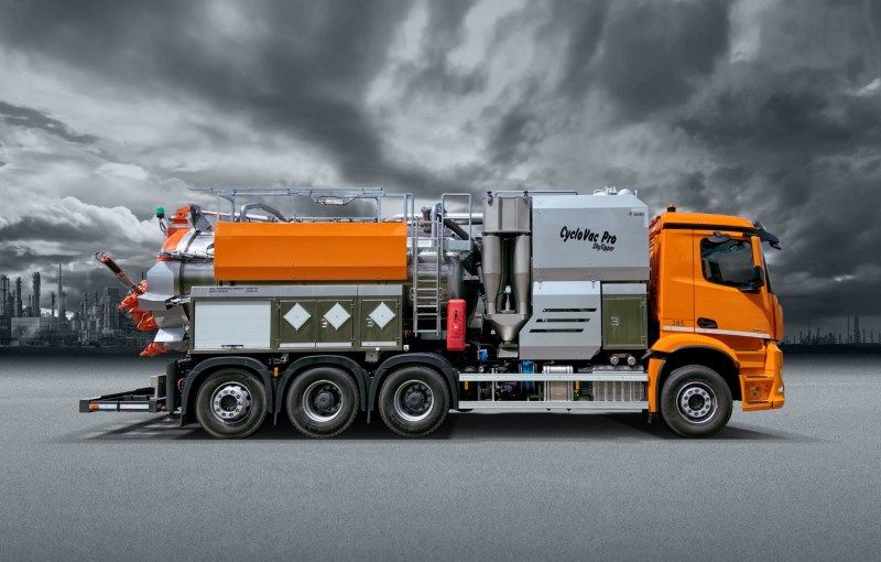 Les hydrocureurs pour matières sèches et humides, homologués ADR/Ex/PED, sont équipés de différents dispositifs de sécurité supplémentaires qui les rendent conformes pour le transport de matières dangereuses sur la voie publique. Exemples : barres de protection contre les chocs / roulements, verrouillage de réservoir, raccordement d'azote, etc.