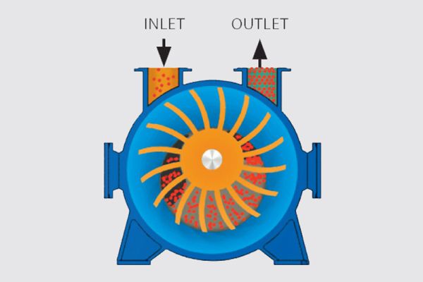 The liquid acts as a piston as it moves away from the rotor hub to create a suction effect. As the cell passes the bottom of the chamber, the liquid begins pressing in towards the rotor hub. This causes the air to be forced out of the cell, filling it with liquid ready for the next suction cycle.